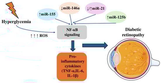 Chronic low-grade inflammation is a pivotal contributor to the pathogenesis and progression of diabetic retinopathy. Persistent hyperglycemia fosters a detrimental microvascular metabolic environment that activates multiple inflammatory pathways [9]. In this context, a wide range of inflammatory mediators—such as adhesion molecules, cytokines, chemokines, and regulatory factors—are upregulated in the diabetic retinal microvasculature [10,11,12]. Hyperglycemia also promotes oxidative stress through excessive production of reactive oxygen species (ROS), activation of inflammasomes, and induction of a pro-inflammatory phenotype [13]. Importantly, microRNAs (miRNAs) have emerged as key post-transcriptional regulators within these inflammatory cascades.