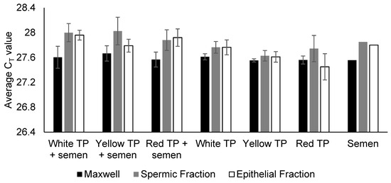 Internal PCR control (IPC) CT values for TP-treated cloth samples spiked with and without semen. TP-treated cloth samples spiked with semen were extracted using Maxwell (n = 2 for each colour) and differential (n = 5 for each colour) DNA extractions. TP-treated cloth samples without addition of semen (white TP, yellow TP, red TP) were used as negative controls. Untreated cloth sample (i.e., without TP pigment) spiked with semen (labelled as "Semen") was used as positive control. Consistent IPC CT values of around 27.5 were obtained for all samples, indicating the absence of PCR inhibition as per the manufacturer’s guidelines.