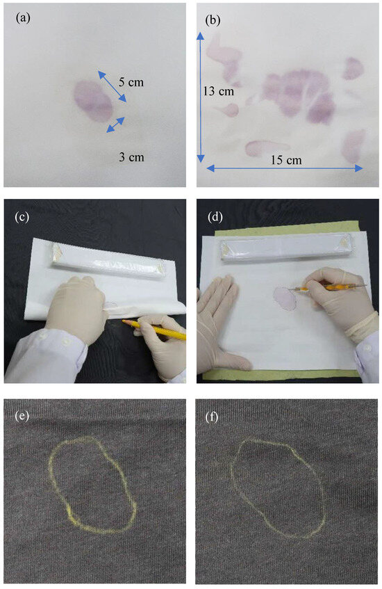 The AP test is a valuable presumptive tool for detecting semen stains in sexual crimes, where the perpetrator may deposit semen on the victim’s clothing or bedding. The AP reaction produces purple stains on chromatography paper, with patterns that vary in complexity based on the intensity and deposition mode of the semen (Figure 3a,b). Current documentation of the AP stain pattern involves flipping the chromatography paper back and forth repeatedly to mark out the AP stain boundaries with crayons onto the exhibit (Figure 3c). In the present study, using TP, boundaries could be directly replicated on the exhibit with a single or minimal tracing action (Figure 3d). Both the crayon and TP methods successfully delineated the AP stain boundaries on the exhibit (Figure 3e,f). Notably, boundaries traced with TP were fainter, owning to the indirect nature of the transfer process and the consequently lower pressure applied to the exhibit’s surface. Nevertheless, they remained sufficiently visible for stain selection.