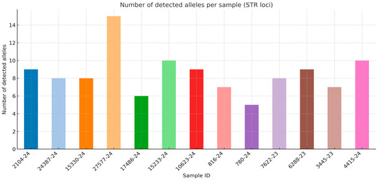 The number of detected STR alleles was compared across FFPE-derived DNA samples. The bar chart illustrates the allelic recovery per sample, highlighting differences in amplification success and the variability in STR profile completeness (Figure 2).