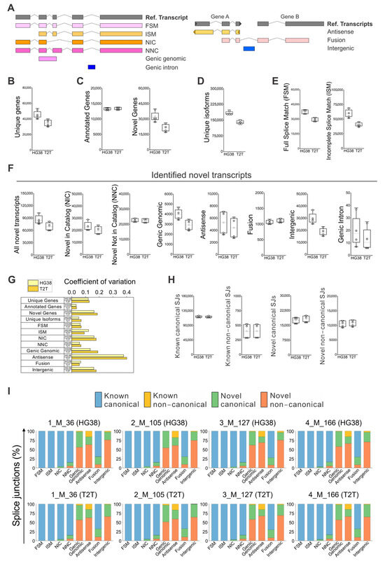 Identification of known and novel genes and isoforms in peripheral blood using GRCh38 (HG38) and T2T-CHM13 (T2T) genome references. (A) SQANTI classification for isoforms [25,26], briefly: Full Splice Match (FSM), Incomplete Splice Match (ISM), Novel in Catalog (NIC), Novel Not in Catalog (NNC), Genic genomic, Genic intron, Antisense, Fusion, and Intergenic. Iso-Seq data analyzed with GRCh38 and T2T-CHM13 references for the identification of: (B) all unique genes, (C) annotated and novel genes within all unique genes, (D) identified unique isoforms; and (E) FSM and ISM isoforms. (F) Identified novel isoforms, NIC, NNC, antisense, fusion, genic genomic, intergenic, and genic intron isoforms. (G) Coefficient of variation (CV) calculated for each type of isoform (A–F) for determining the distribution variability of detected isoforms among individuals, which is a value indicative of physiological diversity among individuals. The coefficient of variation was defined as the ratio of the standard deviation to the average of distribution [27]. (H) Absolute numbers of “Known canonical SJs”, “Known non-canonical SJs”, “Novel canonical SJs”, and “Novel non-canonical SJs” quantification by GRCh38 and T2T-CHM13. (I) Detail of splice junctions’ percentage by type of SJs for known and novel subcategories of isoforms. (B–F,H) N = 4; white boxes show the interquartile range (25–75% percentile range), the median is designated by the horizontal line, and the mean is indicated by the white square. Boundaries of the whiskers are based on the 1.5 interquartile range value, and all observed data points outside the limit of the whiskers are considered outliers.