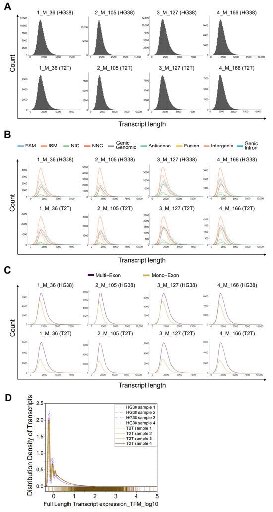 Raw PacBio Iso-seq data (BAM files) were aligned to the GRCh38 or T2T-CHM13 genome (GCA_009914755.4 [T2T-CHM13v2.0]) using pbmm2 v10.0 (Release Version 1.10.0 · PacificBiosciences/pbmm2 · GitHub). Isoform analysis was performed with Isoseq v4.0.0 (https://github.com/PacificBiosciences/IsoSeq, accessed on 13 October 2023) and classification of full-length isoforms with Pigeon v1.0.0 (https://isoseq.how/classification/pigeon.html, accessed on 12 December 2022) from the aligned data was performed. Sequence analysis processing was performed at the Research and Development Center for Precision Medicine, Tsukuba University. SQANTI3 (ver. 5.0, GitHub—ConesaLab/SQANTI3: Tool for the Quality Control of Long-Read Defined Transcriptomes) was used by the analysis pipeline of Bioengineering Lab. Co. (Sagamihara, Japan). The isoforms were annotated with gene transfer format (GTF) files downloaded from the UCSC Genome Browser [10]: for HG38, https://hgdownload.soe.ucsc.edu/goldenPath/hg38/bigZips/genes/hg38.ncbiRefSeq.gtf.gz (accessed on 29 February 2024); for T2T, https://hgdownload.soe.ucsc.edu/goldenPath/hs1/bigZips/genes/hs1.ncbiRefSeq.gtf.gz (accessed on 29 February 2024). Both GRCh38 and T2T-CHM13 genome references can be downloaded from the NCBI. Users should note that genomic coordinates and annotations differ between the two references, and mapping and annotation should be performed consistently to ensure reproducibility [14]. The mRNA transcript isoforms were filtered for a count value of at least 2 unique molecules per million of reads. All plots were created by using Origin, Version 2021 (OriginLab Corporation, Northampton, MA, USA), except if stated otherwise.