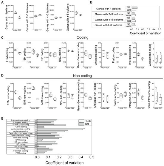 Features of coding and non-coding isoforms in peripheral blood using GRCh38 (HG38) and T2T-CHM13 (T2T) genome references. (A) Number of isoforms per gene; (B) variability of number of isoforms per gene among samples for both GRCh38 and T2T-CHM13 references. (C) Number of coding isoforms by subcategories, and (D) number of non-coding isoforms by subcategories. (E) Identified isoform number variability among individuals in the context of differences between “Coding” and “Non-coding” subcategories for both GRCh38 and T2T-CHM13 references. (A,C,D) N = 4; white boxes show the interquartile range (25–75% percentile range), the median is designated by the horizontal line, and the mean is indicated by the white square. Boundaries of the whiskers are based on the 1.5 interquartile range value; all observed data points outside the limit of the whiskers are considered outliers. (B,E) The coefficient of variation was defined as the ratio of standard deviation to the average of distribution [27].