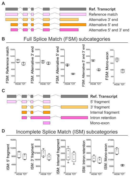 Identification of FSM and ISM isoform subcategories in peripheral blood using GRCh38 (HG38) and T2T-CHM13 (T2T) genome references. (A) SQANTI classification for subcategories of FSM isoforms [25,26]: “Alternative 5′ end”, “Alternative 5′ and 3′ end, and “Mono-exon”. (B) Number of isoforms by subcategories of FSM. (C) SQANTI classification for subcategories of ISM isoforms [25,26]: “5′ fragment”, “3′ fragment”, “Internal fragment”, “Intron retention”, and “Mono-exon”. (D) Number of isoforms by subcategories of ISM. (B,D) N = 4; white boxes show the interquartile range (25–75% percentile range), the median is designated by the horizontal line, and the mean is indicated by the white square. Boundaries of the whiskers are based on the 1.5 interquartile range value, and all observed data points outside the limit of the whiskers are considered outliers.