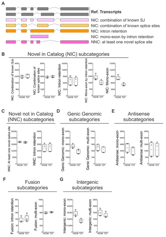 Identification of NIC and NNC isoform subcategories in peripheral blood using GRCh38 (HG38) and T2T-CHM13 (T2T) genome references. (A) SQANTI classification for subcategories of NIC and NNC isoforms [25,26]: “Combination of known SJs”, “Combination of known splice sites”, “Intron retention”, “Mono-exon by intron retention”, and “At least one novel splice site”. (B) Number of isoforms by subcategories of NIC. (C) Number of isoforms by subcategories of NNC. (D) Number of isoforms by subcategories of Genic Genomic. (E) Number of isoforms by subcategories of Antisense. (F) Number of isoforms by subcategories of Fusion. (G) Number of isoforms by subcategories of Intergenic. (B–G) N = 4; white boxes show the interquartile range (25–75% percentile range), the median is designated by the horizontal line, and the mean is indicated by the white square. Boundaries of the whiskers are based on the 1.5 interquartile range value, and all observed data points outside the limit of the whiskers are considered outliers.