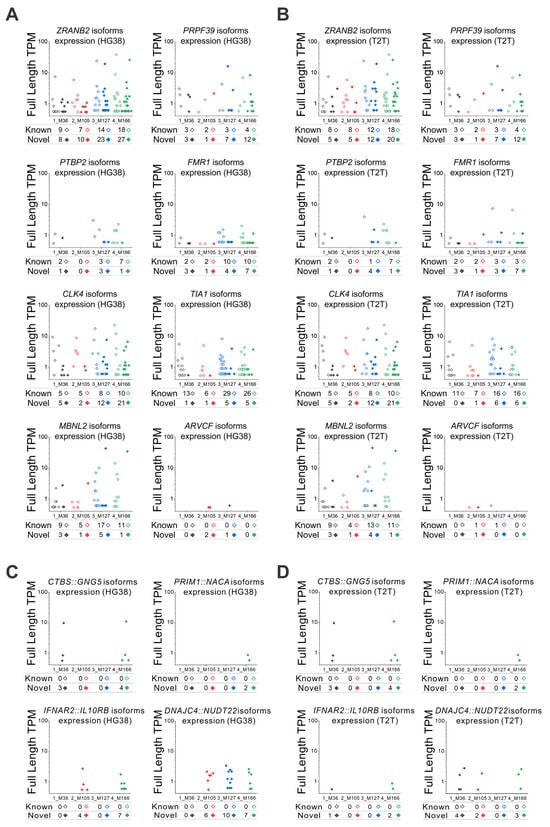 We selected eight genes of interest that are related to mRNA splicing and modulation to verify the expression of each known and novel isoform when GRCh38 (Figure 6A) or T2T-CHM13 is used as the reference genome (Figure 6B). The expression in transcripts per million (TPM) of each single isoform for each gene and for each sample was obtained by lrRNA-seq, and the summation of all isoforms’ expressions corresponded to the overall expression of the considered gene. We can observe that the counts and expressions of known and novel isoforms can be very variable among genes. Moreover, within the analysis of the same gene, counts and expressions of isoforms are very different among individuals, even those with no apparent disease. The trend of overall expressions is similar whether the GRCh38 or T2T-CHM13 reference is used (Figure 6A,B). In some cases, for example in the analysis of the FMR1 gene, in two samples (3_M127 and 4_M166), the number of isoforms identified by using GRCh38 (Figure 6A) is higher than when using T2T-CHM13 reference (Figure 6B), but on the other hand, the expression of one of the isoforms for the same gene for both 3_M127 and 4_M166 samples is about 10 times higher when T2T-CHM13 is used. In addition, since fusion genes are critical for the development of new diagnoses and new drugs, we selected four fusion genes for testing the isoform expression (Figure 6C,D): CTBS::GNG5, involved in nonneoplastic hematologic disorders in the lymph node and spleen, as well as in epithelial lesions in bladder, skin, and lung [30]; PRIM1::NACA, related to chronic myeloid leukemia [31]; IFNAR2::IL10RB, involved in lung nonneoplastic epithelial disorder [32]; and DNAJC4::NUDT22, related to lung adenocarcinoma [33]. Since the blood samples were from healthy individuals, we did not expect high levels of isoform expression related to these fusion genes. Nonetheless, we could confirm that the trend of detected expressions also approximately matched whether GRCh38 or T2T-CHM13 was used (Figure 6C,D). For CTBS::GNG5 and PRIM1::NACA, the results were very similar, while for IFNAR2::IL10RB and DNAJC4::NUDT22, a certain degree of difference was noticed. We could also confirm the detection in blood of other isoforms derived from fusion genes specific to different organs, such as: FOXP1::EIF4E3, ABI2::CYP20A1, and CTSD::IFITM10, related to breast adenocarcinoma [33,34,35,36]; HAVCR1::TIMD4 and JAK3::INSL3, related to kidney adenocarcinoma [34,36,37]; and HACL1::COLQ and SIDT2::TAGLN, related to lymph node nonneoplastic disorders [30,36].