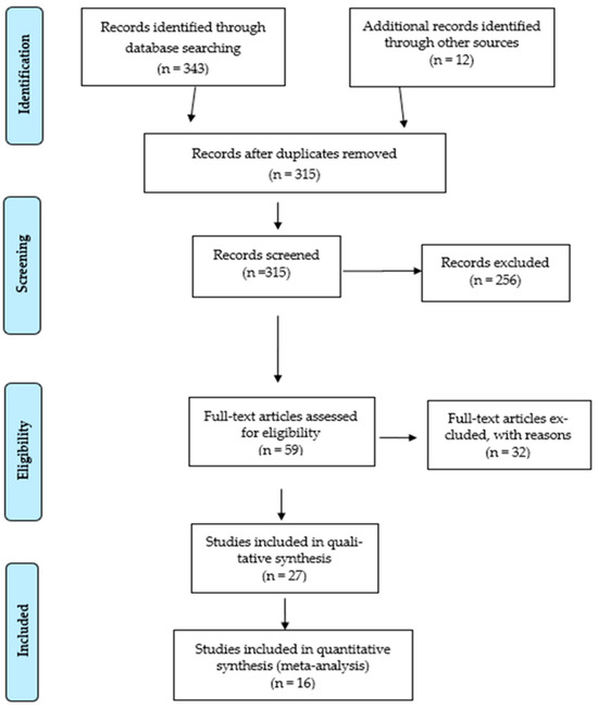After reviewing all databases (Web of Science, Scopus, MEDLINE/PubMed, SPORTDiscuss, ProQuest Central, and Google Scholar), a total of 355 articles (343 + 12) were screened. In the first step, 40 duplicate articles were identified and removed. After this step, the authors assessed whether each of the remaining 315 articles met all inclusion criteria, which led to the exclusion of 256 articles. Full-text evaluation was then performed, leading to the exclusion of 32 studies due to reasons such as lack of reported genetic data (n = 17), populations not engaged in team sports (n = 1), and incomplete data or inadequate methodology (n = 14). Of the 27 studies that remained, 11 were subsequently excluded from the synthesis because they presented redundant data, non-comparable methodology, or insufficient information for result extraction. In the end, 16 studies were included in the systematic review analysis [20,21,22,23,24,25,26,27,28,29,30,31,32,33,34,35] (Figure 1).