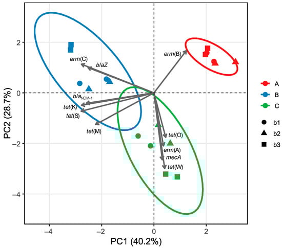 Samples from producer A were distinctly separated from those of producers B and C, primarily along the positive axis of PC1, reflecting elevated levels of erm(B) gene. Conversely, samples from producer C clustered toward the lower PC2 region, correlating with higher levels of tet(O), tet(W), mecA, and erm(A) genes. Samples from producer B displayed a distinct clustering pattern along the negative axis of PC1, primarily influenced by elevated levels of erm(C) and blaZ genes. Of note, the close spatial grouping of samples from the same producer and batch suggests a high degree of batch-level consistency in AMR genes composition within each producer.