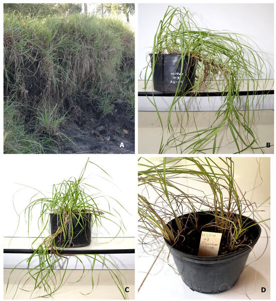 Figure 1. Accession plants of P. notatum var. saurae. (A) H1961 natural population from Entre Ríos, Argentina. Note the riverbank habitat. (B) Cultivated individual plant from H1961 accession. Note the vigorous rhizomes. (C) Cultivated individual plant from H1740 accession from Itapúa, Paraguay. (D) Cultivated individual plant from H3011#4 accession from Santa Catarina, Brazil.