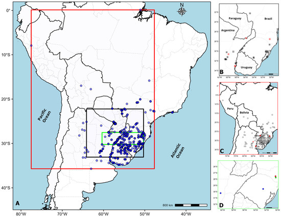 Figure 4. Cytogeography of Paspalum notatum cytotypes in South America. The box colours represent the extent of the zoom performed on maps B, C and D. (A) Spatial distribution of chromosome counts for P. notatum. Blue dots represent the geographic distribution of all localities considered for this study. Note the white areas without dots as gaps in chromosome knowledge about cytotypes living throughout the countries. (B) Diploid cytotype geographical distribution. Black asterisk = records of diploid specimens from literature review; red asterisk = records of new diploid specimens contributed by this work; circle and cross = records of triploid specimens from literature review. (C) Tetraploid cytotype geographical distribution. White dots black border = records of tetraploid specimens from literature review and new tetraploid specimens contributed by this work; red dots = records of new diploids contributed by this work. (D) Pentaploid and hexaploid cytotype geographical distribution. Pentaploid specimen records from literature review = green dot; new record contributed by this work = red dot; hexaploid specimen records from literature review = blue dots.