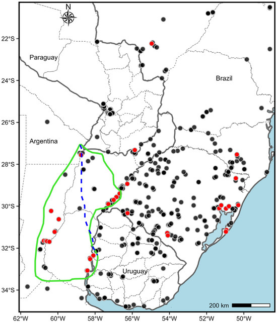Figure 5. Diploid-tetraploid distribution area of Paspalum notatum. Diploid cytotype (red dots) is distributed inside the center of origin of the species (green line) and in ectopic localities in Brazil and Paraguay. Tetraploids (black dots) are positioned around the diploid primary center and extend across a larger area. All ectopic diploids are located outside the region marked with a green line, and are outside of cultivated areas. The dotted blue line indicates the limits of the suggested possible area of origin for the species. All dots represent 2x and 4x accessions detailed in Table S1.