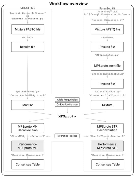 Flowchart of data analysis workflows for the different data types (MH mixtures on the left and STR mixtures on the right). In-house scripts are denoted with quotation marks, while software is referenced without. The probabilistic genotyping software employed for the mixture deconvolution is represented in bold. Created with Biorender.com.