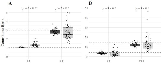 Boxplots representing the variance of the contributor proportions estimated by MPSproto in the 180 MH (dark grey) and 180 STR (light grey) simulated mixtures across all mixture ratios (1:1 and 3:1 in (A), 9:1 and 19:1 in (B)). The black dashed lines represent the expected ratios (1, 3, 9, and 19, for the 1:1, 3:1, 9:1, and 19:1 mixtures, respectively). Each black dot represents the contributor proportion of a mixture, calculated as the proportion of the major contributor divided by the minor contributor. For the balanced mixtures, the contributor proportion was calculated as follows: read counts of the individual with the highest read counts/read counts of the individual with the lowest read counts. The p-values from Wilcoxon rank sum tests are shown at the top of the boxplots, in italics.