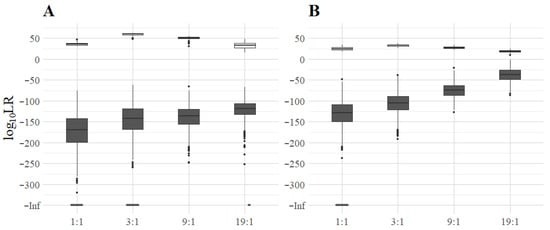 Log10LRs based on (A) the MH-74 plex and (B) the ForenSeq Kit. The white boxes represent the log10LR of the deconvolutions where the ‘suspect’ was in the mixture, whereas the grey ones represent deconvolutions where the ‘suspect’ was not in the mixture. The dark grey dots at the bottom (log10LR = −Inf) were obtained exclusively when the ‘suspect’ was not in the mixture (1344, 1067, and 2 times in the MH 1:1, 3:1, and 19:1 mixtures, respectively, and 116 times in the STR 1:1 mixtures).
