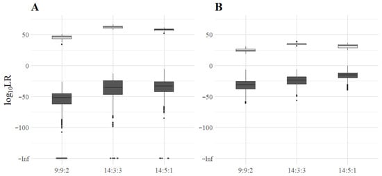 Log10LRs based on (A) the MH-74 plex and (B) the ForenSeq Kit. The white boxes represent the log10LRs of the deconvolutions where the ‘suspect’ was part of the mixture (the minor contributor of 9:9:2 mixtures, the major contributor of 14:3:3 mixtures, and the intermediate contributor of 14:5:1 mixtures), whereas the grey ones represent deconvolutions where the ‘suspect’ was not in the mixture. The dark grey dots at the bottom of the graphs (log10LR = −Inf) were obtained exclusively when the ‘suspect’ was not in the mixture (190, 8, and 6 times in the 9:9:2, 14:3:3, and 14:5:1 MH mixtures, respectively).