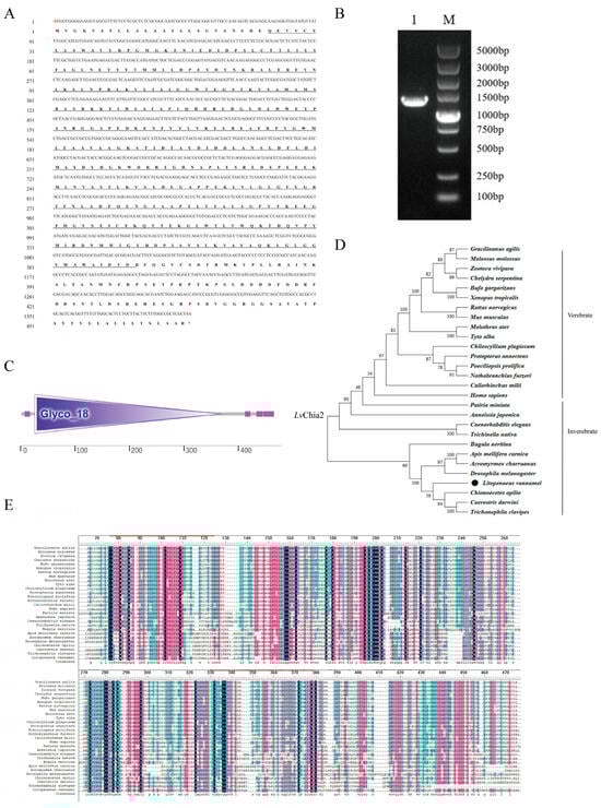 LvChia2 sequence and bioinformatics analysis. (A) The nucleotide sequence and the deduced amino acid sequence of LvChia2. The start codon and stop codon are marked in red font, and the underlined parts indicate the domain positions (B) Electrophoresis of LvChia2. (C) The domain architecture of LvChia2 was predicted by SMART. (D) Phylogenetic tree of aligned amino acid sequences of LvChia2; the black circle marked LvChia2. (E) Protein sequence alignment of LvChia2 protein from shrimp and that from other species.