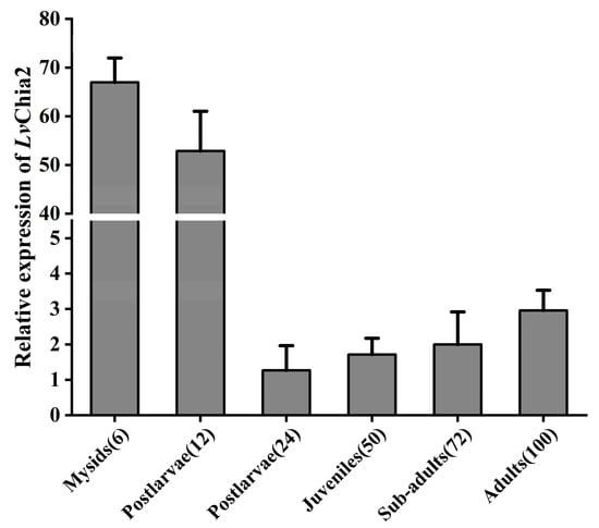 The expression level of LvChia2 in the muscles of shrimp at various developmental stages was assessed. The results indicated that the mRNA expression level of LvChia2 during the larval stage of shrimp with bran was significantly higher than that in other stages. Although the expression level decreased in the post-larval stage (12 DPH), it remained relatively high. Upon entering the shrimp seedling stage, the expression level was significantly downregulated, suggesting that LvChia2 may play the role in the metamorphosis of shrimp. During the developmental transition from juvenile to adult shrimp, the expression level exhibited a slight upward trend (Figure 2). These findings suggest that LvChia2 may have previously unrecognized roles in adult shrimp.