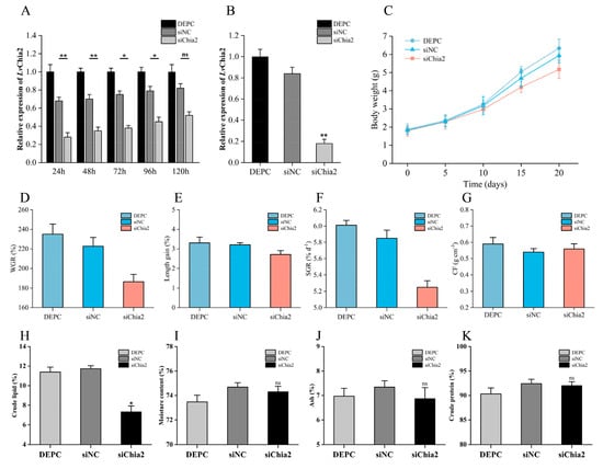 LvChia2 promotes the growth of L. vannamei by enhancing its lipid storage capacity. (A,B) RNA knockdown efficiency of LvChia2. The detection of knockdown efficiency was conduct within 120 h (A) and the expression level of LvChia2 after 20 days of knockdown (B). (C–G) Growth performance of shrimp following 20 d of RNAi treatment; changes in body weight (C), body length (D), weight gain rate (WGR) (E), shrimp growth rate (SGR) (F) and condition factor (CF) (G) after knockdown of LvChia2. (H–K) Analysis of the muscle components of shrimp after knocking down LvChia2 for 20 d; The changes in crude lipid (H) moisture content (I), Ash (J), and crude protein (K) after knockdown of LvChia2. The DEPC group was used as the blank control and siNC was used as the negative control. The results are based on three replicate data and shown as mean ± SD (* p < 0.05, ** p < 0.01, ns p > 0.05).
