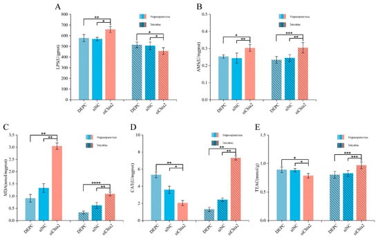 Detection of hepatopancreas and intestinal enzyme activities of L. vannamei following knockdown of LvChia2. (A,B) Detection of hydrolase activities (LPS, α-amylase) in the hepatopancreas and intestines of shrimp. (C–E) Detection of immune-related effects (MDA, CAT, TEAC) in the hepatopancreas and intestines of shrimp. The DEPC group was used as the blank control and siNC as the negative control. The results are based on three replicate data and shown as mean ± SD (* p < 0.05, ** p < 0.01, *** p < 0.001, **** p < 0.0001).