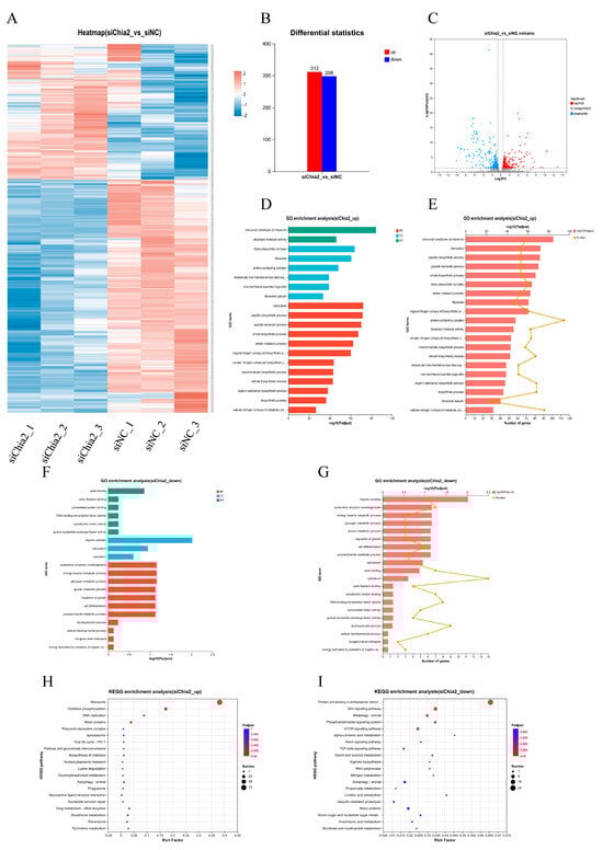RNA-seq analysis of muscle tissue in L. vannamei following LvChia2 knockdown. (A–C) RNA-seq analysis of shrimp with LvChia2 knockdown after 20 d. siNC was injected as a control. (A) Cluster plots of DEGs; the horizontal axis represents the sample names and the clustering results of the samples, while the vertical axis represents the DEGs and their clustering results. The colors indicate the expression levels of DEGs in the samples. Histogram (B) and volcano plot (C) analysis of DEGs in the siChia2 treatment groups. (D–G) GO classification and enrichment analysis of DEGs in the siChia2 treatment groups. (D,F) GO classification of DEGs showing increases and decreases; the vertical axis represents the GO terms, and the horizontal axis indicates the significance level of enrichment, corresponding to the height of the columns. A smaller FDR and a larger −log10 (Padjust) value indicate more significant enrichment of the GO term. The three colors represent the three major classifications: biological processes (BP), cellular components (CC), and molecular functions (MF). (E,F) GO enrichment analysis of DEGs showing increases and decreases; the vertical axis represents the GO terms, while the horizontal axis below indicates the number of genes/transcripts associated with each GO term in comparison, corresponding to different points on the broken line. The horizontal coordinate above represents the significance level of enrichment, corresponding to the height of the bars. A smaller Padjust and a larger −log10 (Padjust) value indicate more significant enrichment of the GO term. (H,I) KEGG analysis of the top 20 enriched pathways (upregulated pathways in (H); downregulated pathways in (I)) between siNC and siChia2. The x-axis represents the enrichment factor, while the y-axis represents the pathway names. The color indicates the q-value, and the point size reflects the number of genes. The Rich Factor refers to the value of the enrichment factor.