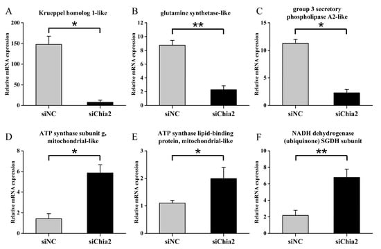 Impact of LvChia2 knockdown on the regulation of core gene expression related to the growth and development of L. vannamei. (A–F) Correlation analysis between siChia2 and siNC (control) for genes closely associated with growth and development, including Kr h-1, GS, sPLA2, ATP5L, ATP5G, ND-SGDH, using RT-qPCR. The results are based on three replicates and are presented as mean ± SD (* p < 0.05, ** p < 0.01).