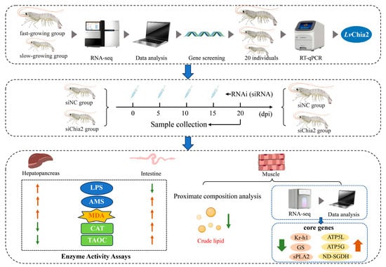 Two small knockdown RNA (siRNA) duplexes targeting LvChia2 (GenBank: LOC113830447) were meticulously designed using the siDirect 2.0 and DSIR algorithms, with rigorous measures implemented to minimize off-target effects, as confirmed by NCBI BLAST analysis (https://blast.ncbi.nlm.nih.gov/Blast.cgi) (accessed on 10 May 2025). These siRNA sequences were chemically synthesized by Sangon Biotech and included dTdT overhangs and phosphorothioate modifications to enhance stability and efficacy. A scrambled siRNA (siNC) was synthesized as a negative control to account for non-specific effects. Eighty-four shrimps were randomly allocated into three groups: the siChia2 group (experimental), the siNC group (negative control), and the DEPC-water group (blank control). The siRNA solution (0.1 μg/mL) was administered via intramuscular injection into the second abdominal segment of the shrimp at a dosage of 5 μg/g of body weight, with injections repeated every 5 days for a total duration of 20 days. Tissue samples, including muscle, hepatopancreas, and intestinal tissues, were collected at multiple time points post-injection (24, 48, 72, 96, and 120 h) for RNA extraction and RT-qPCR validation to assess knockdown efficiency. Additionally, samples were collected 20 days post-injection to verify the subsequent functional impacts.