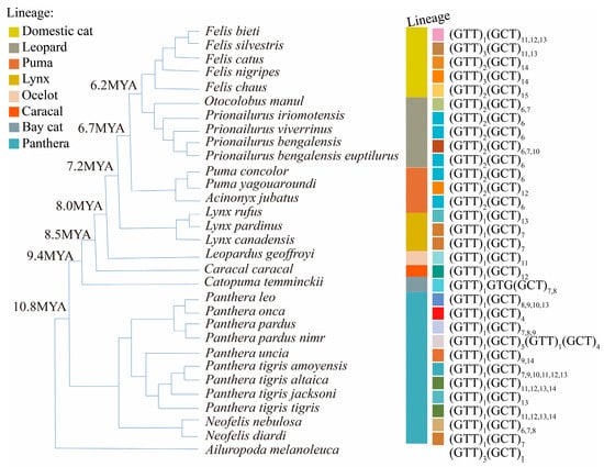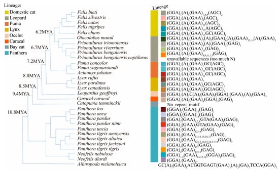Variation in repeat unit motifs at locus Ptia5 across Felidae species. The outermost bar uses color-coded segments to represent distinct repeat unit motifs, while the adjacent color blocks indicate lineage taxonomic classifications [33,34].
