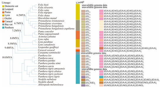Variation in repeat unit motifs at the Ptia2-intron locus among Felidae species. Color-coded segments in the outer ring represent distinct repeat units, while adjacent colored blocks indicate lineage taxonomic classifications [33,34].