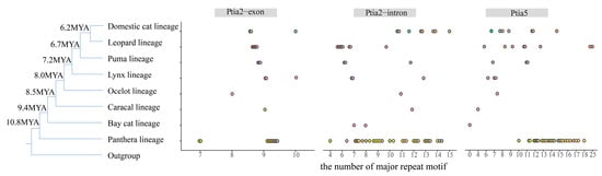 Varieties of major repeat motifs in microsatellite alleles across Felidae lineages at three loci. Phylogenetic relationships and estimated node divergence dates are from Johnson et al. (2006) [33]. Branch lengths are not proportional to evolutionary distance. Each dot represents one allele. Major repeat motifs per locus are shown: Ptia2-exon for (GAG)n, Ptia2-intron for (GCT)n, and Ptia5 for (GAA)n.