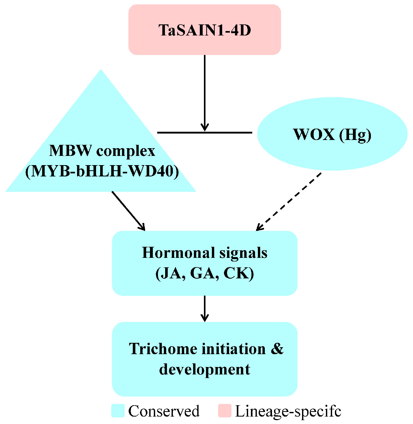 3.9. Comparative Analysis of TaSAIN1-4D and Known Trichome-Related Genes/QTLs