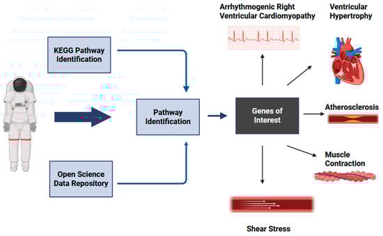 In this study, we utilized the publicly available genetic databases including the Open Science Data Repository (OSDR), the Kyoto Encyclopedia Genes and Genomes (KEGG), and the Space Omics and Medical Atlas (SOMA) to investigate whether known molecular interaction, reaction, and relation networks of cardiovascular diseases, including fluid shear stress, lipid, hypertrophic cardiomyopathy, arrhythmogenic right ventricular cardiomyopathy, and cardiac contraction (Figure 1), have changed differential expression in spaceflight [,]. The SOMA is the most prominent molecular atlas to date of the effects of spaceflight on the human body, comprising nearly 3000 samples from SpaceX’s 2021 Inspiration4, the NASA Twin Study, and JAXA missions. We begin with a system-level perspective using KEGG pathway enrichment and progressively narrow our focus to gene-level signatures derived from the SOMA dataset. We aim to uncover molecular mechanisms underlying structural cardiac changes and the heightened risk of cardiovascular disease observed during and after spaceflight (Figure 1).