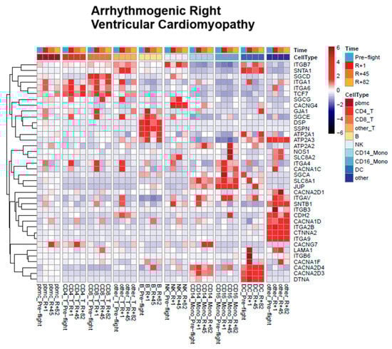 Heatmap displaying scaled log2 FC values for genes involved in arrhythmogenic pathways across immune cell types and spaceflight phases: pre-flight, post-flight (R) [R + 1, R + 45 and R + 82]. Rows represent individual genes and columns represent single-cell transcriptomes grouped by cell type (color-coded, e.g., CD4+ T, CD8+ T, NK, Monocytes, DCs) and spaceflight phase (top bar). Hierarchical clustering was applied to both genes and samples. Red indicates regulation, and blue indicates downregulation relative to OSDR cohort mean. Unless otherwise specified, gene-level results reflect FDR-adjusted tests (padj), and pathway/cytokine results report q-values (FDR) that are consistent with SOMA reporting.