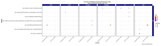 Dot plot of astronaut immune cells generated by comparing cardiovascular disease gene clusters to MSigDB WikiPathways categories using hypergeometric survival function. Values were filtered for padj < 0.05. Bubble color reflects Normalized Enrichment Score (NES) and size indicates statistical significance as –log10(adjusted p-value).