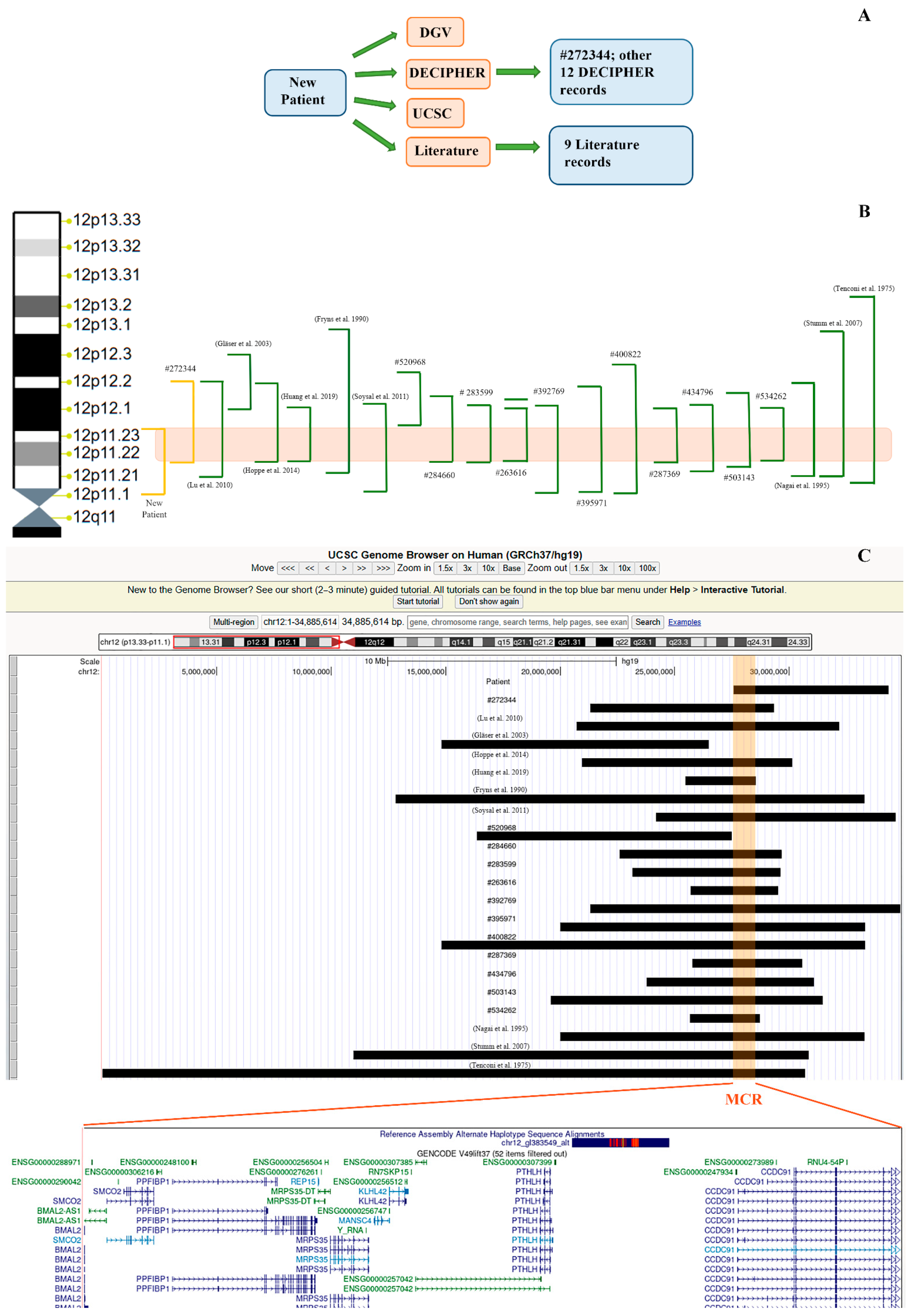 - Lu, H.; Cui, Y.; Shi, Y.; Xia, X.; Liang, Q.; Yao, B.; Ge, Y.; Li, X.; Huang, Y. A girl with distinctive features of borderline high blood pressure, short stature, characteristic brachydactyly, and 11.47 Mb deletion in 12p11.21–12p12.2 by oligonucleotide array CGH. Am. J. Med. Genet. A 2009, 149A, 2321–2323. [Google Scholar] [CrossRef] [PubMed]
