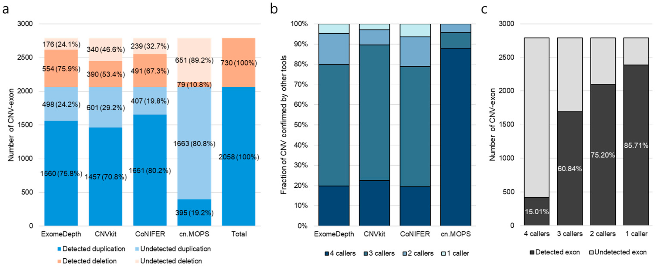 - Zhao, L.; Liu, H.; Yuan, X.; Gao, K.; Duan, J. Comparative study of whole exome sequencing-based copy number variation detection tools. BMC Bioinform. 2020, 21, 97. [Google Scholar] [CrossRef]