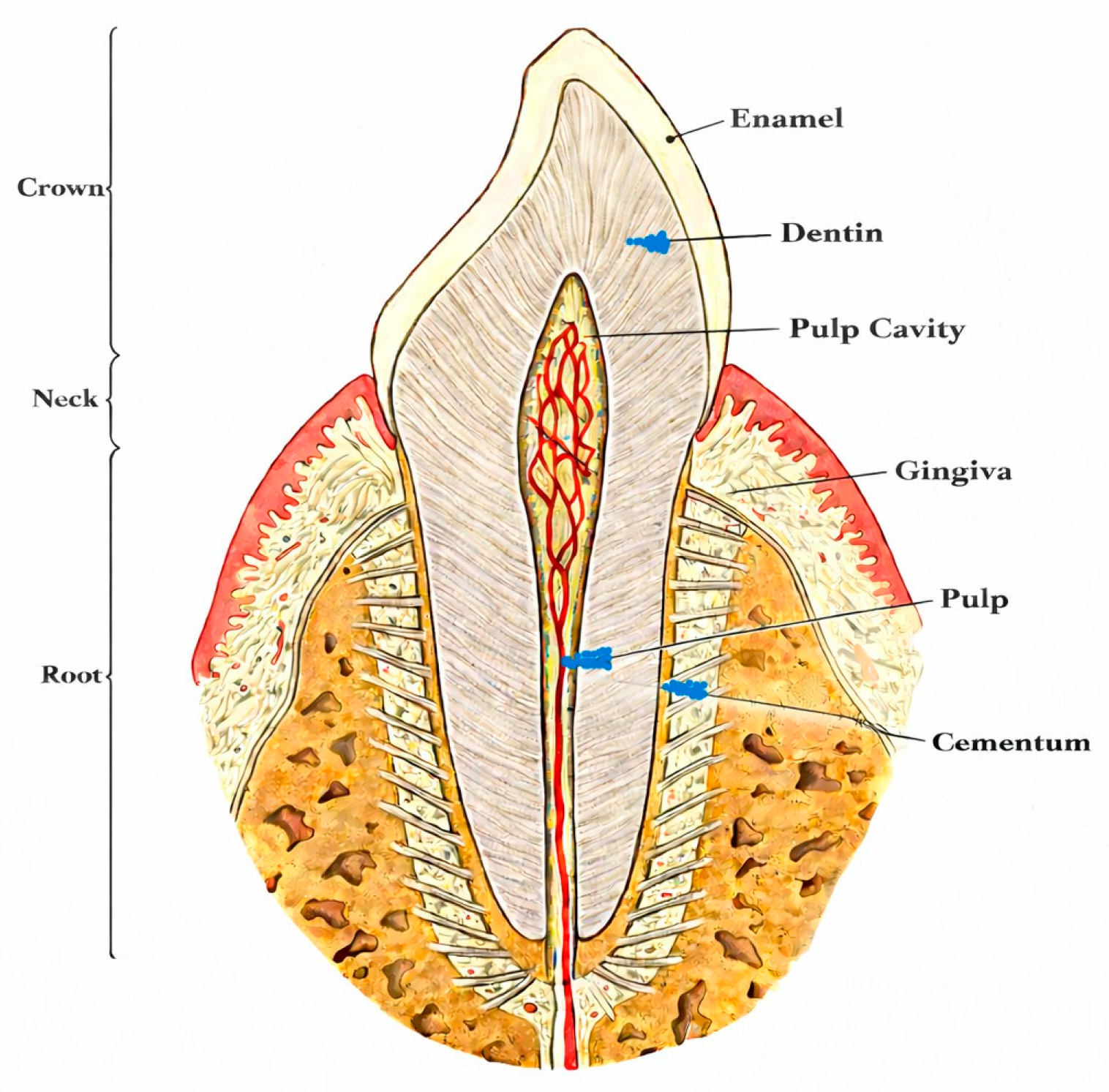 Figure 1) and microarchitecture: enamel comprises approximately 96% mineral content, while dentin and cementum contain around 70% mineral, creating a dense, low-porosity structure that limits penetration by environmental inhibitors and microorganisms [