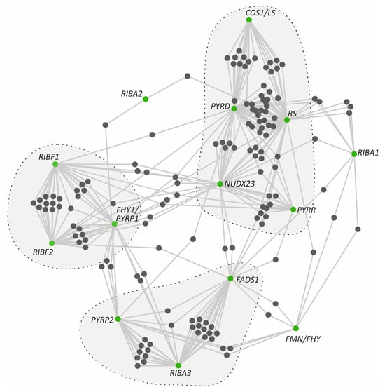 Co-expression network of riboflavin metabolic pathway genes constructed by Cytoscape using co-expression data from ATTED-II. The outlined regions highlight gene clusters exhibiting a tight co-expression pattern, suggesting functional connectivity and coregulation.