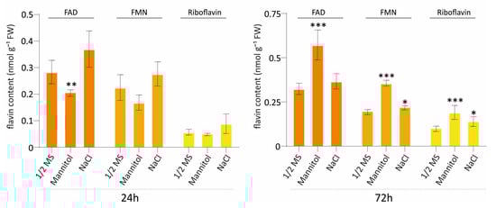 Our results reveal a general downregulation of the core riboflavin-biosynthesis genes after 24 h of osmotic and salt stress, albeit the effect is more pronounced under osmotic stress. However, the FMN/FHY gene, encoding the enzyme that regulates the cytosolic balance between riboflavin and FMN, as well as FHY1/PYRP, encoding the enzyme that reconverts FMN to riboflavin in chloroplasts, were both upregulated under osmotic stress conditions. When we analyzed the flavins after 24 h of stress, we detected a decrease in the pathway’s final product, FMN, only under mannitol stress, where we also observed the strongest expression changes. However, clear increases in riboflavin, FMN, and FAD under both stress conditions were evident after 72 h, consistent with previous reports.