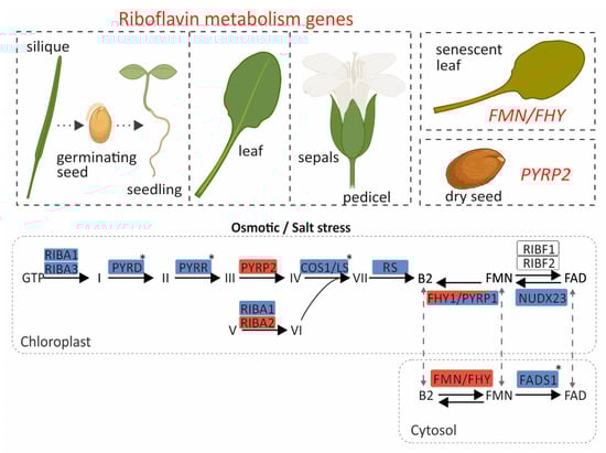 Graphical representation of the transcriptional profile of riboflavin pathway genes in A. thaliana across developmental stages, tissues, and abiotic stress conditions. Upregulated and downregulated genes are shown in red and blue, respectively. Genes highlighted in both colors exhibit induction or suppression depending on the stress type. Genes without color show a stable expression pattern. The asterisks mars genes whose expression is altered only under osmotic stress. Most genes display elevated expression in siliques, germinating seeds, seedlings, and leaves. In contrast, FMN/FHY and PYRP2 maintain relatively stable expression across stages and tissues, being induced only in senescent leaves and dry seeds, respectively. This image was created with BioRender (Daras, G. 2025; https://BioRender.com/3p22o59, accessed on 20 August 2025).