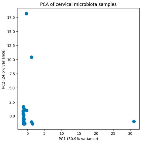 Principal component analysis (PCA) was performed on the filtered relative abundance dataset of cervical microbiota. The first two principal components (PC1 and PC2) explain 50.9% and 24.6% of the total variance, respectively. Samples are widely distributed in ordination space, indicating high inter-individual variability and the absence of distinct clustering patterns based on overall community composition.