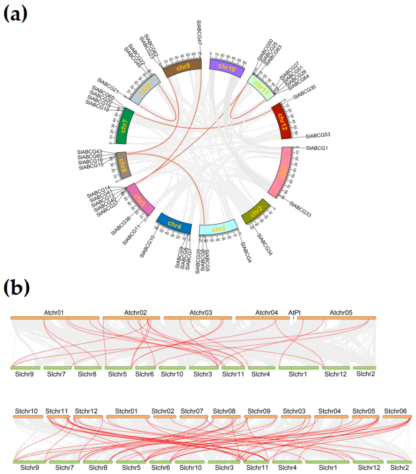 3.3. Synteny and Colinearity Analysis of SlABCG Genes