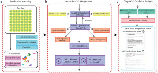 Overview of the scSelector interactive analysis workflow and core functionalities. (a) The routine data processing module. This pipeline accepts raw or preprocessed single-cell data and performs standard steps, including data preprocessing (e.g., QC, normalization), dimensionality reduction (e.g., PCA, UMAP), and clustering (e.g., Leiden algorithm), to generate a 2D visualization. (b) The interactive cell manipulation module. Users can select any cell population of interest directly on the visualization plot using either a freehand lasso or point-by-point selection. Once selected, various operations can be performed on the target cells, including exporting, modifying visual styles, or repositioning. A key feature is the ability to set a control group for comparative analysis. As illustrated, there are two distinct options for setting the control group: (1) selecting another specific cell population as the control or (2) using all other cells in the dataset as the control. (c) The target cell population analysis module. For a selected population and its control, scSelector performs differential expression and functional enrichment analyses. These results are then used as inputs for the integrated large language model (LLM) to generate a comprehensive interpretation report. The type of report generated corresponds to the control group selected in step (b). Specifically, comparing the target group to an alternate group (b-1) yields a Cell State Prediction Report (c-1) focused on functional differences, whereas comparing it to all other cells (b-2) is used to generate a Cell Type Prediction Report (c-2) for identity prediction.
