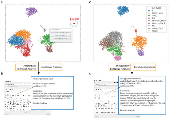 Large language models (LLMs) were utilized to assist in interpreting those results. After providing necessary contextual information (such as dataset background, list of differentially expressed genes, pathway enrichment results) and API credentials, the model not only correctly identified the platelet identity of this cell population but also provided a detailed interpretation of the identification conclusion based on key molecular evidence, such as the highly expressed PF4 and PPBP genes and significantly enriched pathways, like platelet activation and alpha granules (Figure 2a,b).