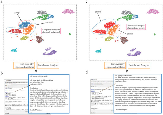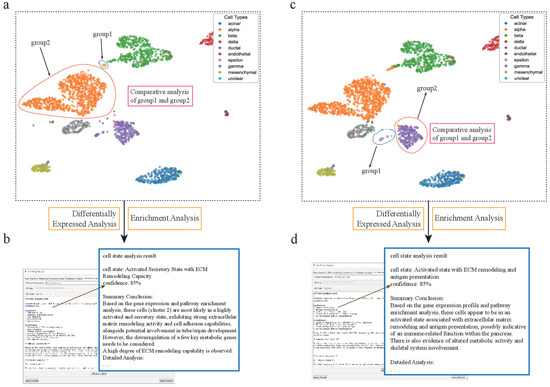 scSelector reveals functional heterogeneity within pancreatic alpha cell subpopulations. (a) UMAP visualization of the human pancreas dataset, highlighting heterogeneity within alpha cells, which form distinct subpopulations. The blue subcluster (group1) is selected for comparative analysis against the other alpha cells (group2). (b) The AI analysis output for the subcluster in (a) (corresponding to Alpha-Sub1 in the text), predicting its functional state as an “Activated, Remodeling and Interacting State” with 90% confidence. (c) In a second analysis, the orange/red alpha cell subcluster (labeled group1) is selected for comparison against the remaining alpha cells (group2). (d) The corresponding AI analysis for the subcluster in (c) (corresponding to Alpha-Sub2 in the text), predicting its state as an “Activated, adhesion-related and matrix remodeling state possibly related to wound healing and immune response” with 85% confidence.
