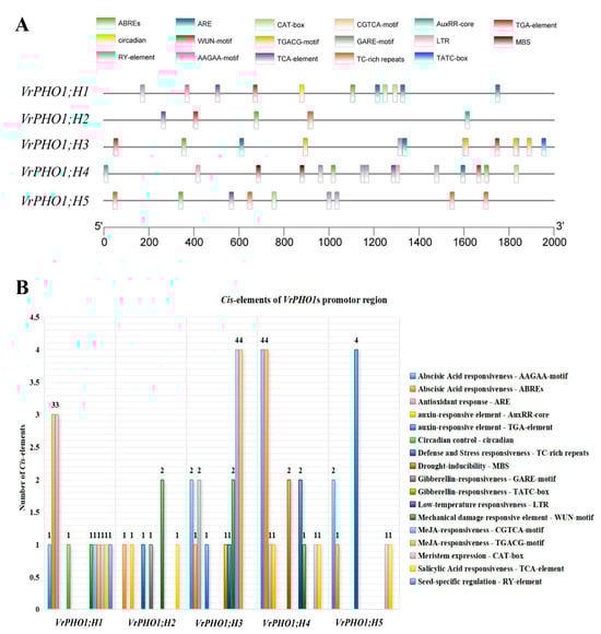 In order to gain deeper insight into the function of the VrPHO1s, a sequence spanning 2000 bp upstream of the start codon of the mung bean PHO1 gene was extracted and uploaded to the Plant CARE website for analysis (Figure 5). The aim of this analysis was to identify key cis-acting elements. The analysis revealed that all five genes collectively contain 17 light signal response elements. Of these, 10 types comprise plant hormone (auxin, salicylic acid, abscisic acid, jasmonic acid, and gibberellin) response elements. In the field of stress biology, the study of response elements to abiotic stress (i.e., low temperature, drought, and mechanical injury) has been a subject of considerable research interest. Notable examples of such elements include GARE-motif, ABREs, and AuxRR-core elements. In addition, four elements have been identified as responding to abiotic stress (i.e., cold, drought, and mechanical injury), namely, WUN-motif, MBS, and LTR. Furthermore, five elements have been implicated in growth and development (i.e., related to circadian rhythms, seed specificity, and meristem expression), including circadian and CAT-box elements. Of these, VrPHO1; H2 contains the fewest light response elements at six, while VrPHO1; H4 contains the most at fifteen. The remaining genes contain eleven, thirteen, and nine, respectively. An analysis of cis-acting elements within the promoter regions of five VrPHO1 genes was conducted, which revealed the presence of multiple elements associated with environmental stress and hormone responses. The elements in question include the drought response element MBS, the abscisic acid response element ABRE, the auxin-responsive element TGA, the low-temperature response element LTR, and elements involved in defense and stress responses.