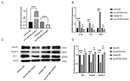 Section 2.7, SBMECs were transfected with either oar-miR-29b mimic or oar-miR-29b inhibitor to achieve gain- or loss-of-function of oar-miR-29b, the expression of inflammatory factor mRNA was detected by q-PCR, and the expression of tight-junction proteins was detected by WB. The results showed that the mRNA levels of inflammatory factors TNF-α, IL-1β, and IL-6 were significantly increased when oar-miR-29b was overexpressed (