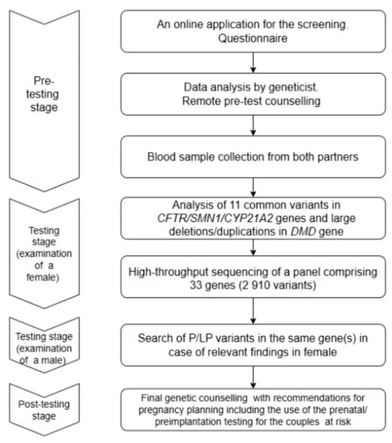 Glotov AS, Nasykhova YA, Lazareva TE, Dvoynova NM, Shabanova ES, Danilova MM, Osinovskaya NS, Barbitoff YA, Maretina MA, Gorodnicheva EE, et al. Pilot Study of Preconception Carrier Screening in Russia: Initial Findings and Challenges. Genes. 2026; 17(1):3. https://doi.org/10.3390/genes17010003