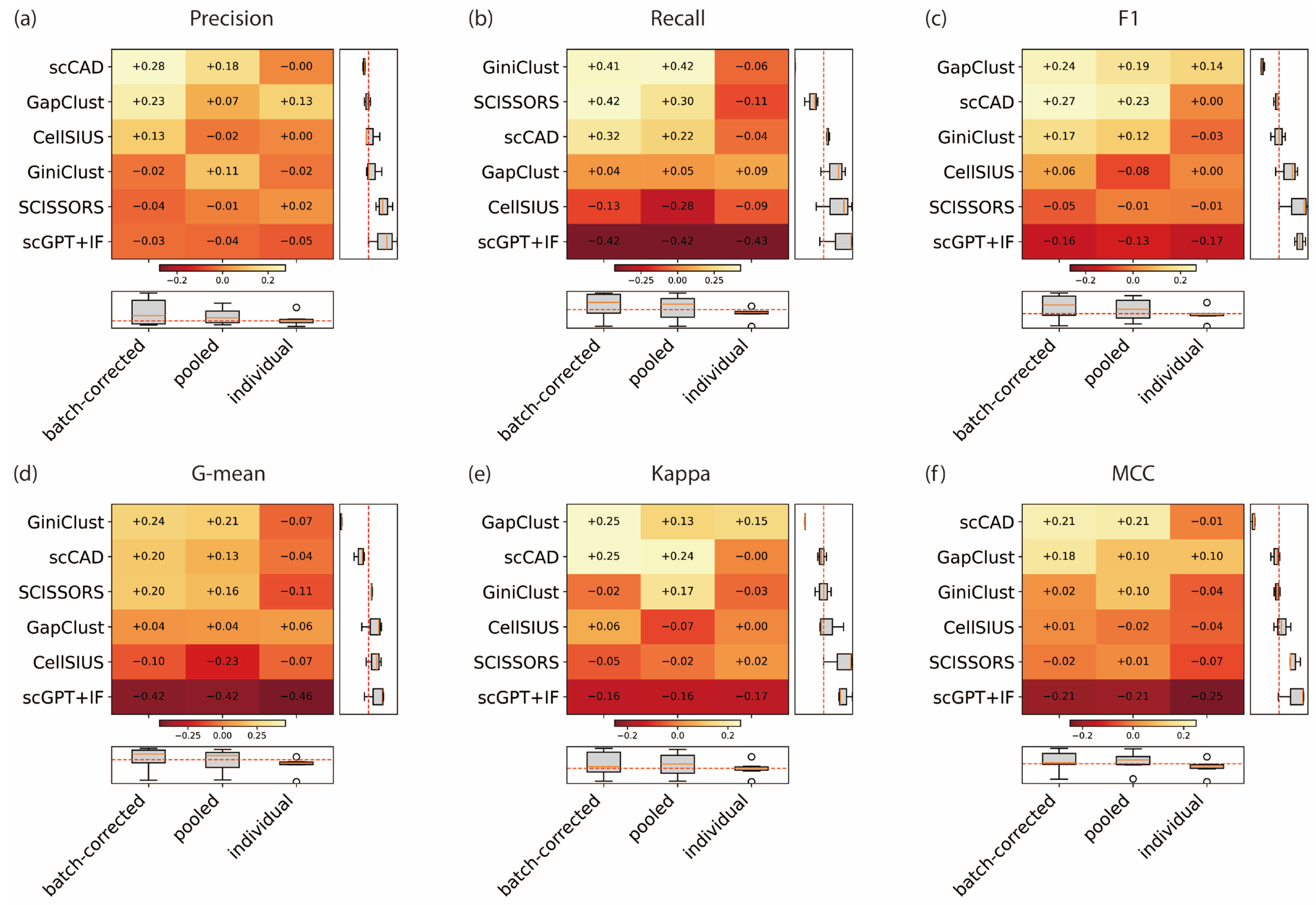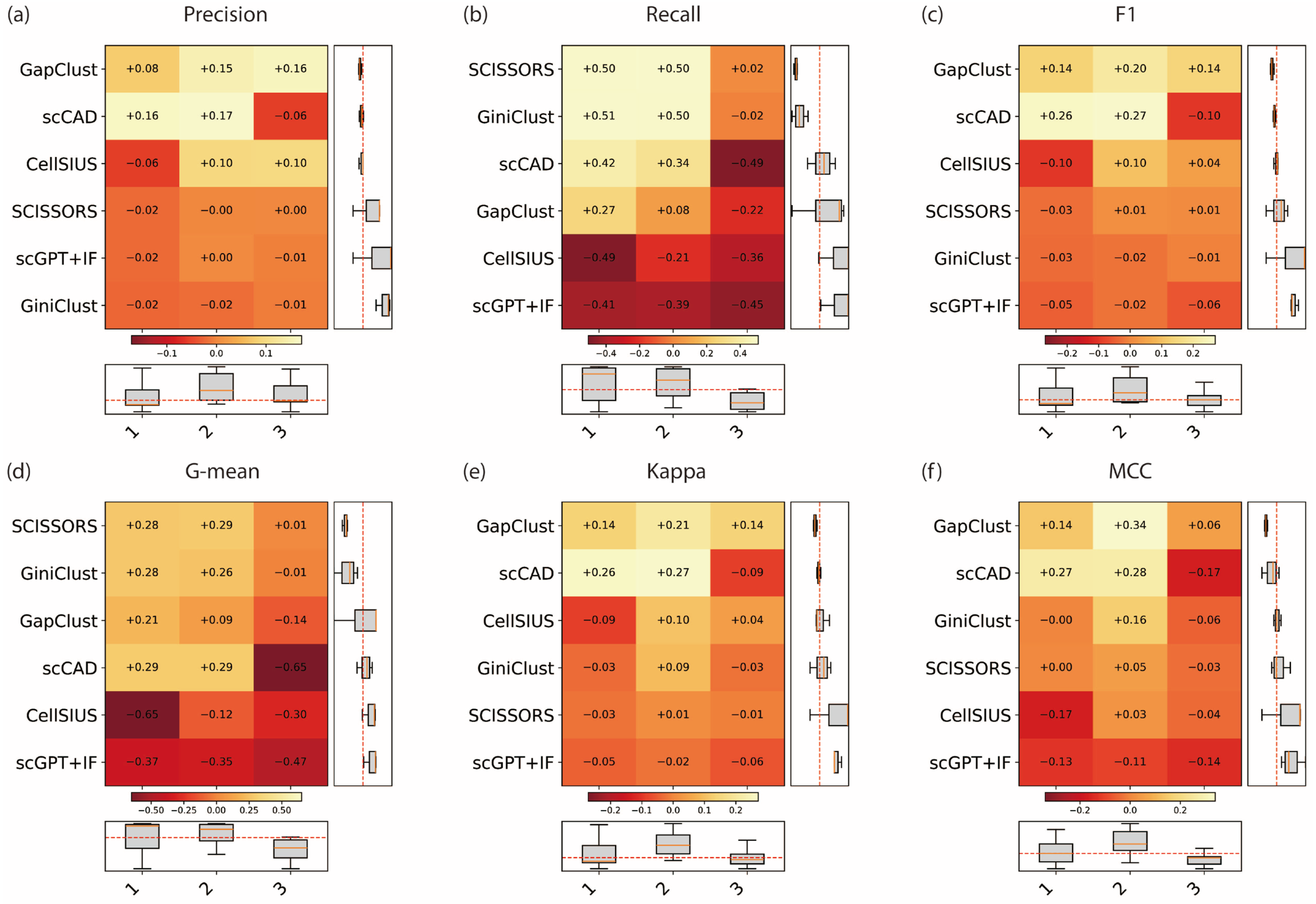 - Recall (Sensitivity) measures the proportion of true rare cells correctly identified by the method, reflecting its ability to minimize false negatives. It is computed as: