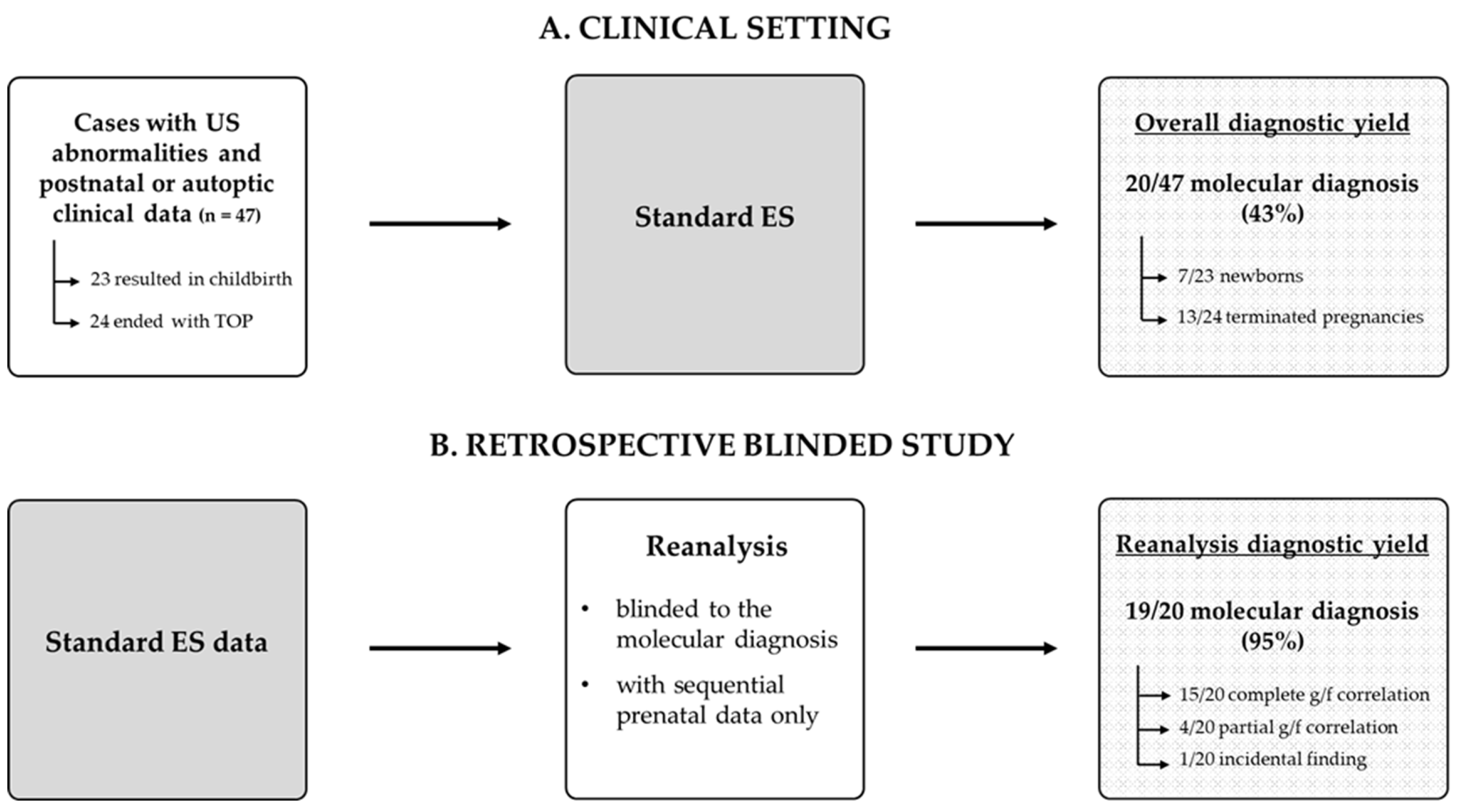 - Dempsey, E.; Haworth, A.; Ive, L.; Dubis, R.; Savage, H.; Serra, E.; Kenny, J.; Elmslie, F.; Greco, E.; Thilaganathan, B.; et al. A report on the impact of rapid prenatal exome sequencing on the clinical management of 52 ongoing pregnancies: A retrospective review. BJOG Int. J. Obstet. Gynaecol. 2021, 128, 1012–1019. [Google Scholar] [CrossRef] [PubMed]
