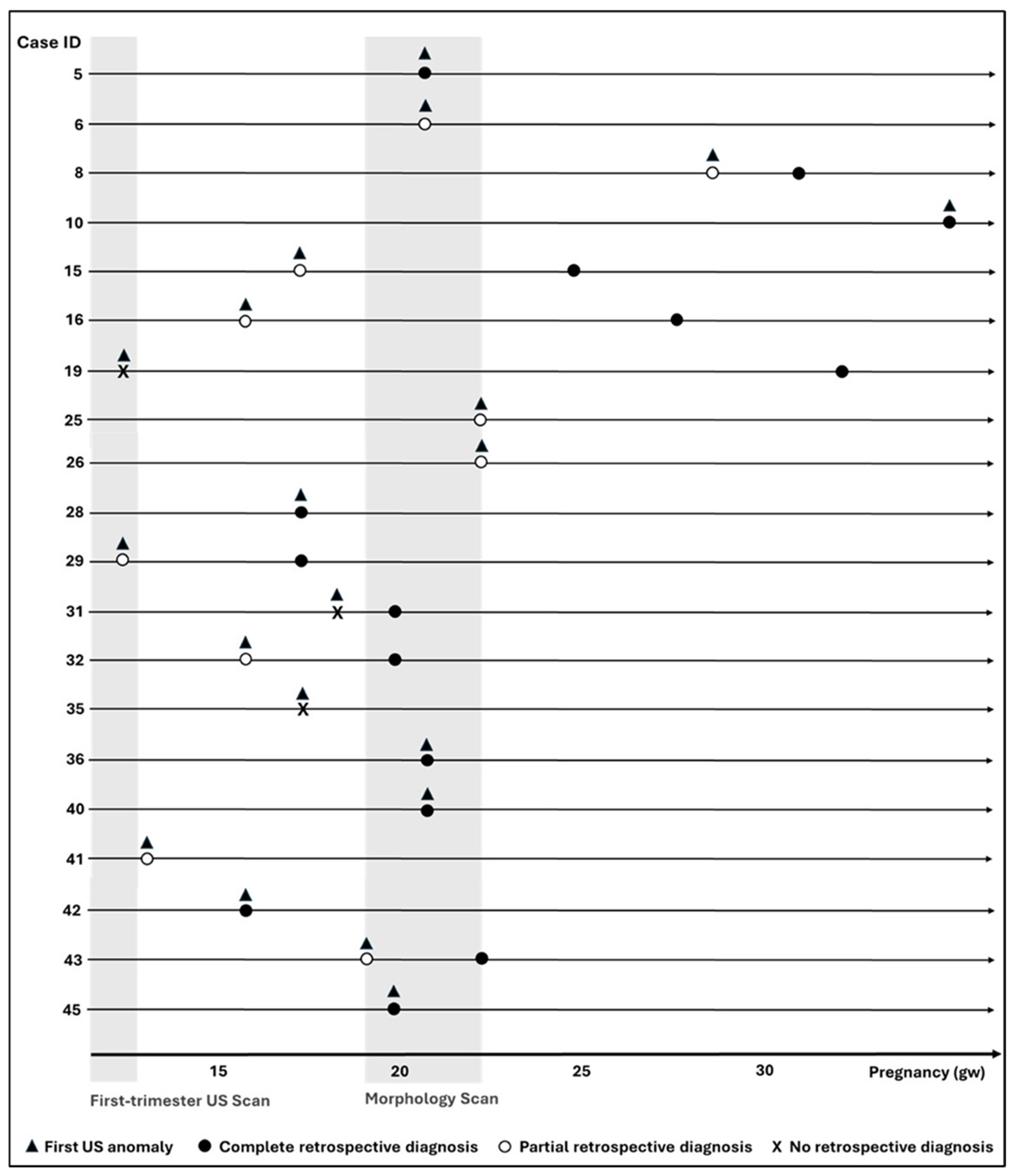 - Sileo, F.G.; Finarelli, A.; Contu, G.; Lugli, L.; Dipace, V.; Ballarini, M.; Guidi, C.; Facchinetti, F.; Bertucci, E. Ultrasound screening for fetal anomalies in a single center: Diagnostic performances twenty years after the Eurofetus Study. J. Matern.-Fetal Neonatal Med. 2024, 35, 6312–6319. [Google Scholar] [CrossRef]